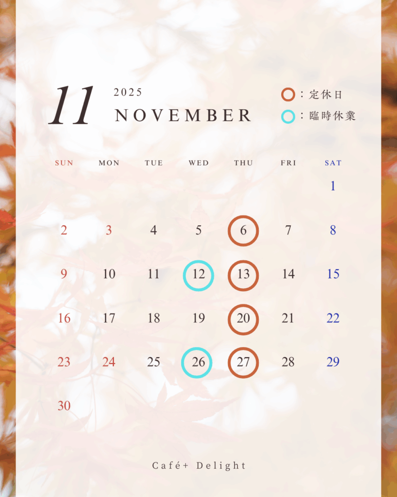 〈 定休日 〉11/6・13・20・27 〈 臨時休業 〉11/12・26(水)