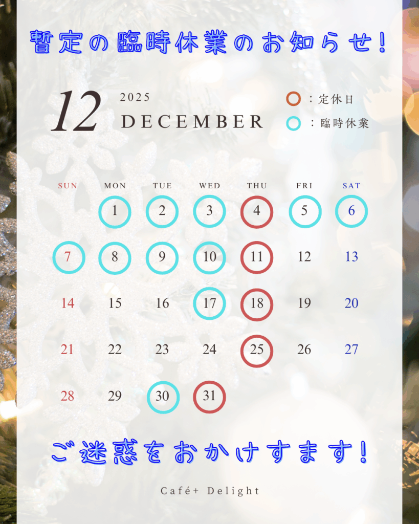 〈 臨時休業 〉12月の臨時休業になります。暫定の営業カレンダーです。変更があれば直ぐに更新します。ご迷惑をおかけします。
